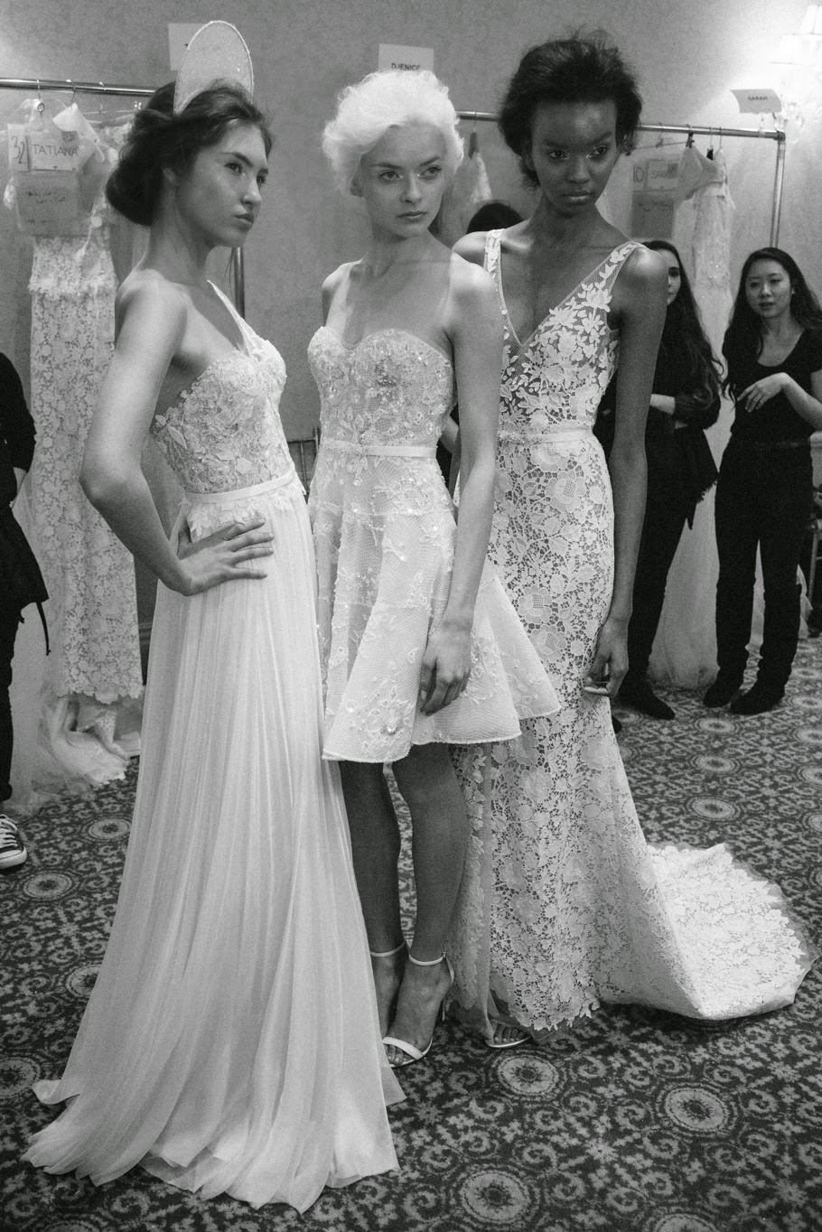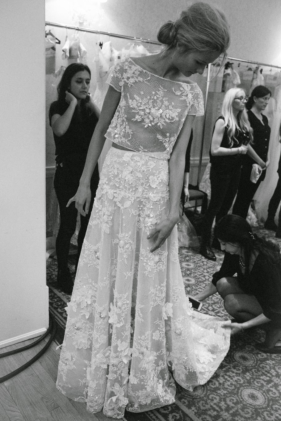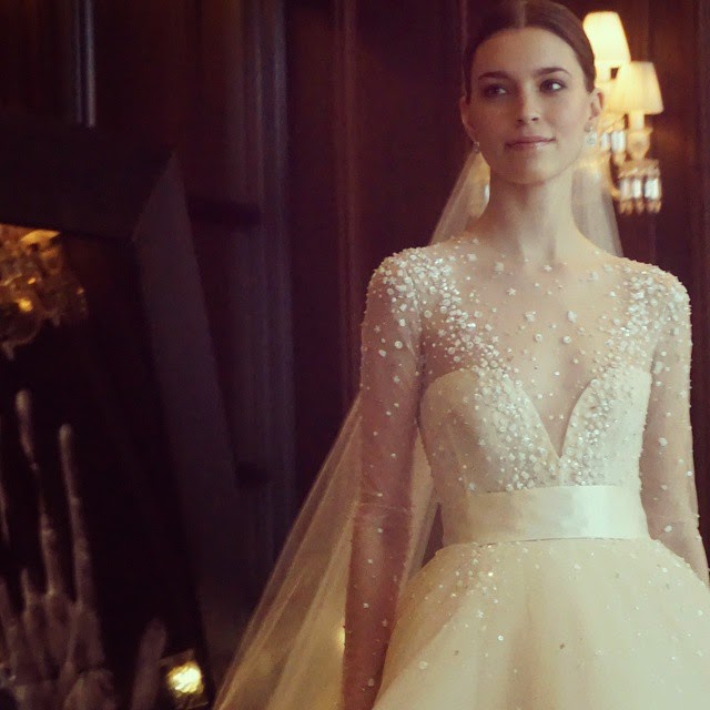 From embellished sheaths and embroidered trumpet silhouettes to glamorous voluminous gowns, each piece embodies a modern fantasy. Delicate embroidery, floral lace appliqués, layers of tulle and intricate embellishment bring a magical quality to each dress. While deep V- Necklines, cut outs and low back detailing add an element of sensuality to the collection.