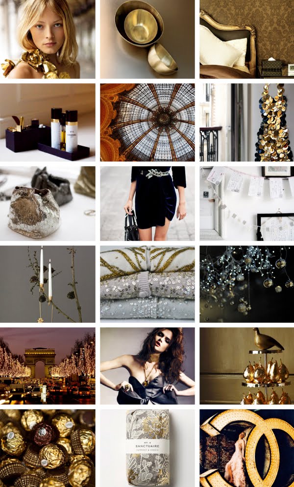 A little Monday inspiration for the holidays from one of my favorite bloggers, Sarah Klassen ... "Softly snowed branches and silver ... plenty of gold, copper and silvery grey sets the mood—with touches of vintage glass, silky pewter, berry, soft white and crème. To finish off, a bit of nature—some sticks to create a screen, with minimal but effective haute adornments."